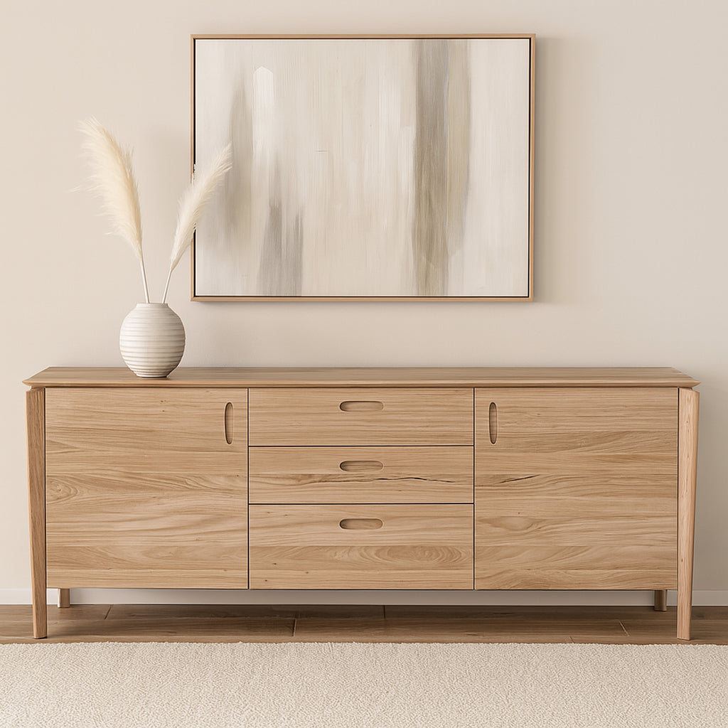 The Torre buffet kitchen cabinet features a solid construction made from Australian Blackbutt timber.