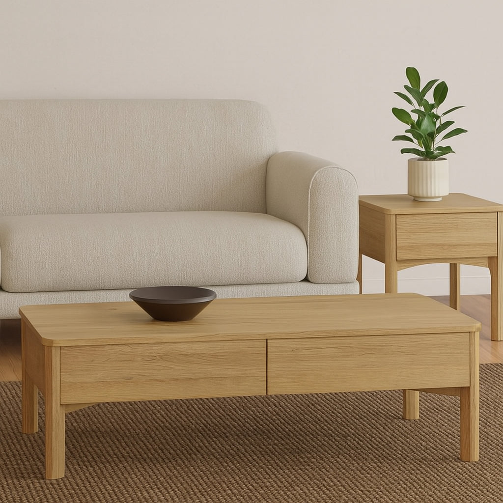 The Willow Coffee Table is made from American Oak with a natural finish and features two functional drawers for convenient storage. The Willow Lamp Table, crafted from natural oak hardwood, includes one drawer for added practicality.
