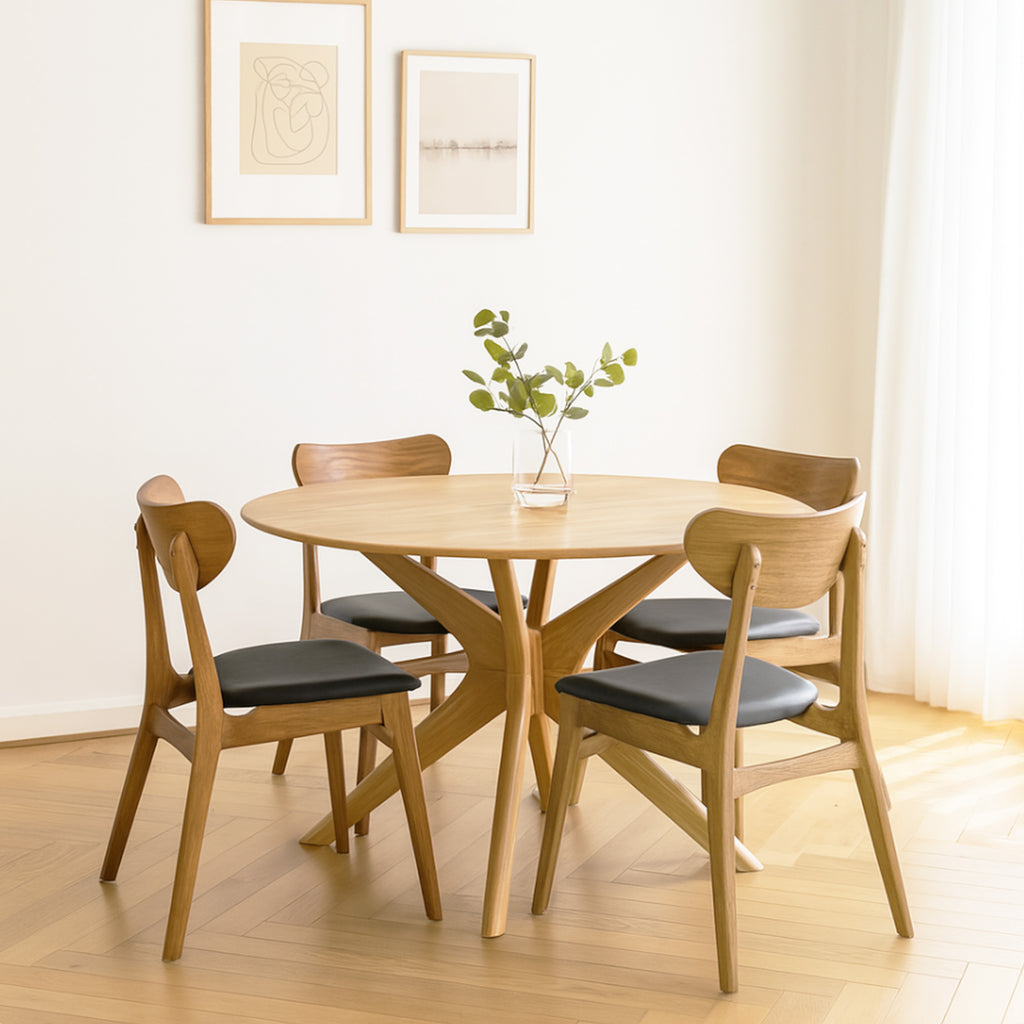 The York dining table in Malaysian Hardwood with Finland dining chairs.