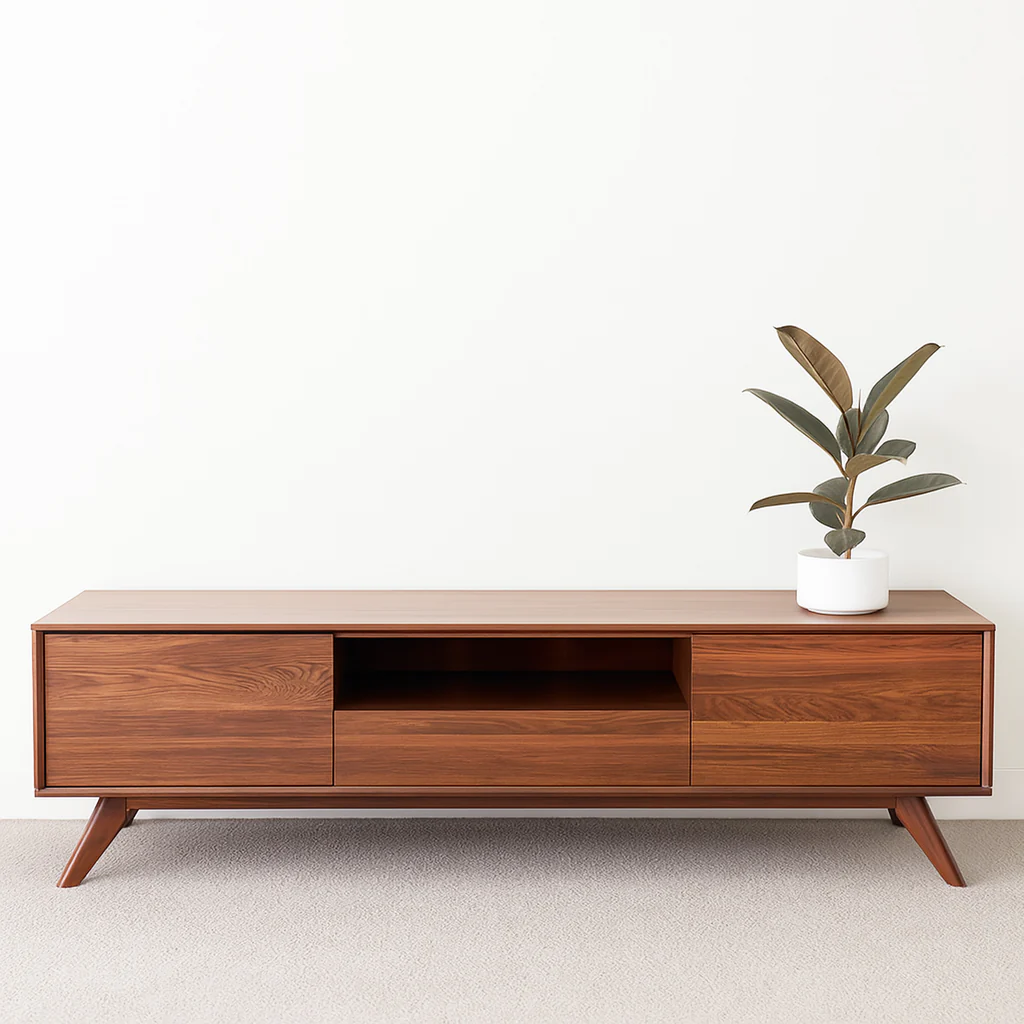 Evie TV entertainment unit features drawers and cupboards, made from sold Blackwood timber.