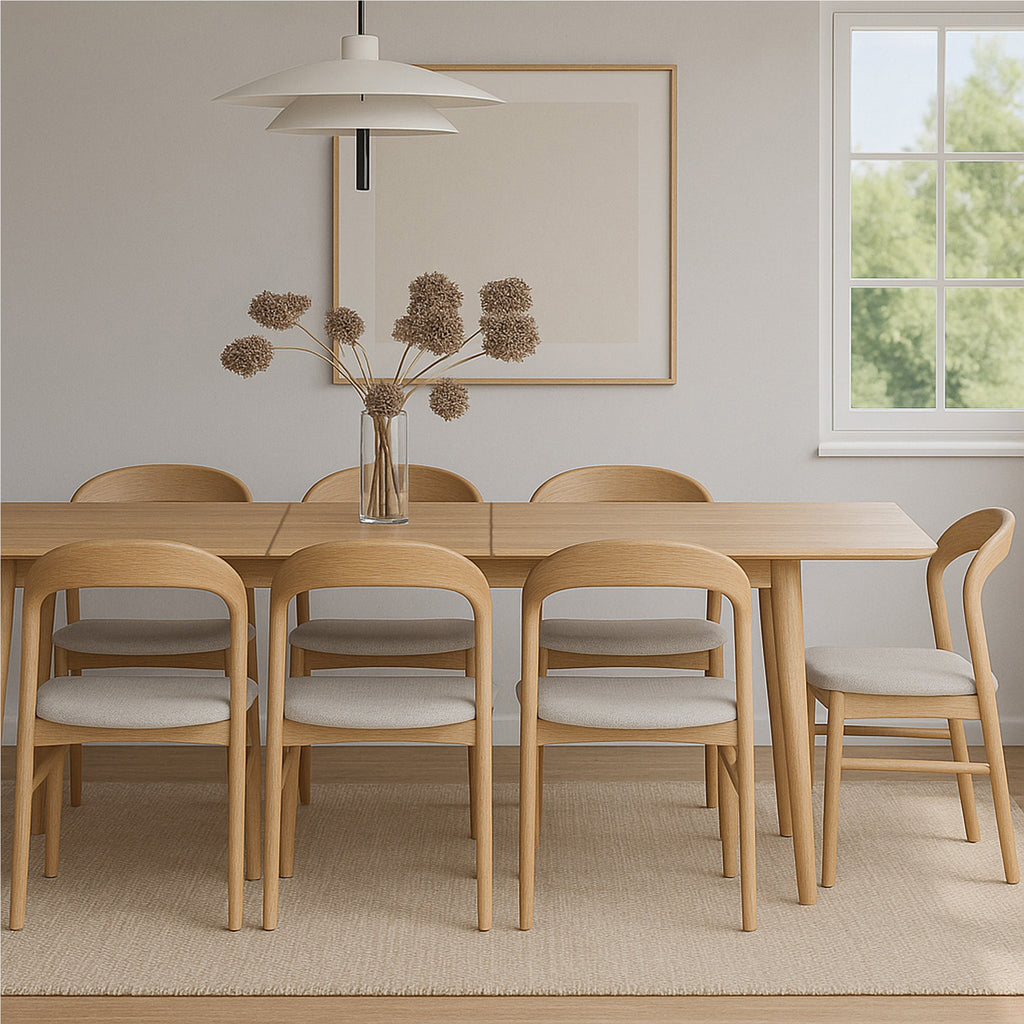 The Erin extension dining table showcases a modern aesthetic combined with a convenient auto-extension mechanism. Crafted from solid Natural Oak and veneer wood, it offers durability and style. This table is also offered alongside the coordinating Willow Dining Chair for a cohesive dining set.