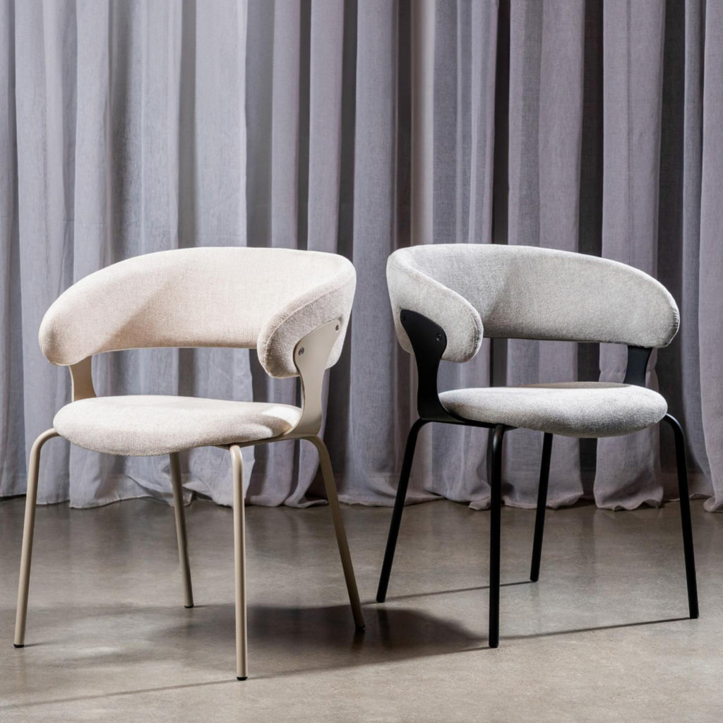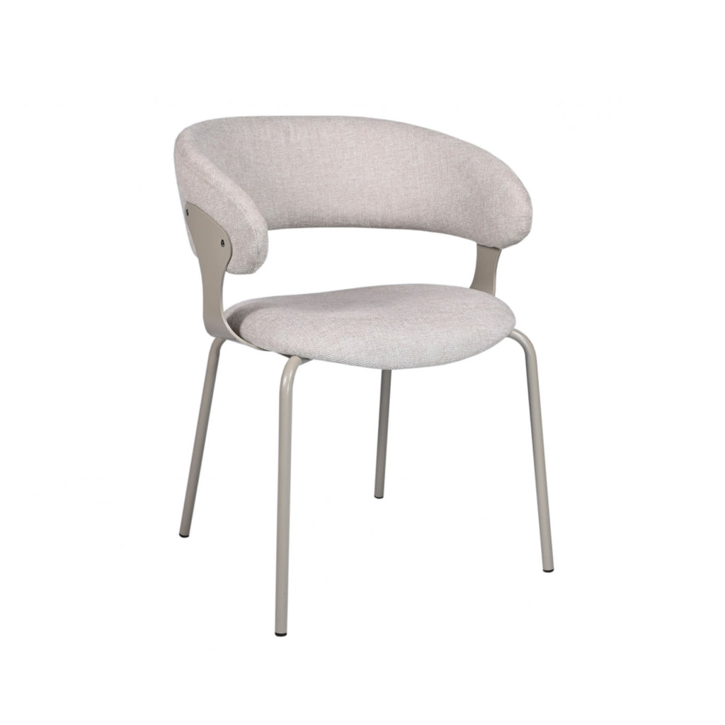 Kenny dining Chair features a modern bucket style seat with Latte Chenille Fabric upholstery and Latte Metal Frame.
